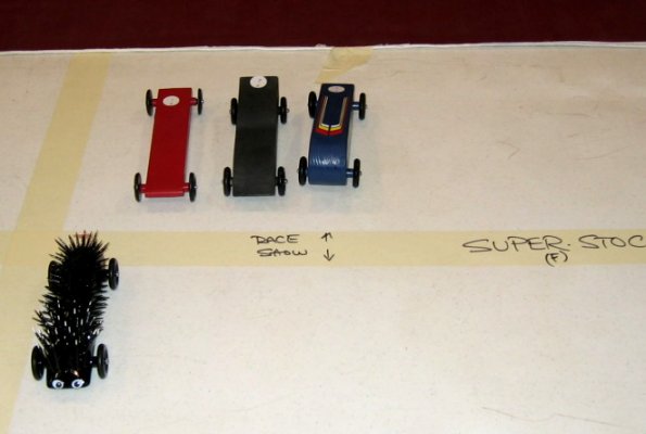 | Cars are started at the top of the track gaining momentum thru the flat until they trip the computer aided finish line. | |||
